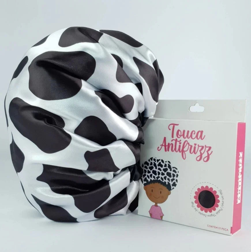 Soulta Touca Cetim Anti Frizz com Elástico Ajustável Vaquinha Camada Dupla: touca estilosa com estampa de vaquinha e camada dupla de cetim, ideal para proteger os cabelos contra frizz e manter a hidratação durante o sono.